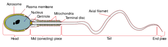 "LadyofHats - Drawing Anatomy of a spermatozoon - English labels" at AnatomyTOOL.org by Mariana Ruiz Villarreal is in the Public Domain.