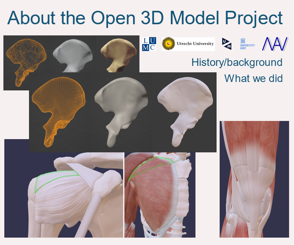 The departments of anatomy of Leiden University Medical Center, University Medical Center Utrecht, Maastricht University Medical Center and University of Leuven KULAK endeavour to create an Open Source and Free 3D Model of Human Anatomy and make it easily usable for teachers and students. An initial grant for this work was received from the Dutch Ministry of Education, Culture & Science. The model is based on predecessor models BodyParts and Z-Anatomy.